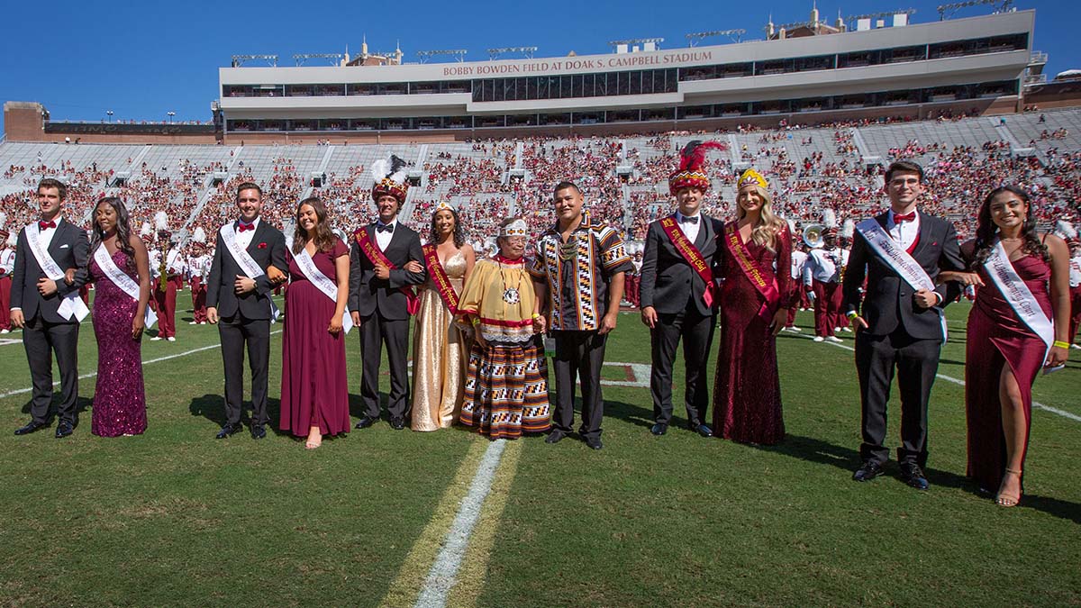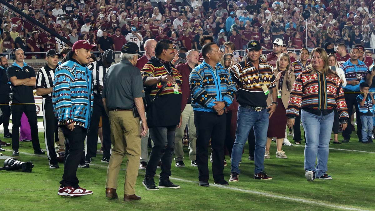 Seminole Tribe of Florida Tribal Council members Larry Howard, Marcellus Osceola Jr., Christopher Osceola, and Holly Tiger are recognized as honorary captains before the 2023 Homecoming game.
