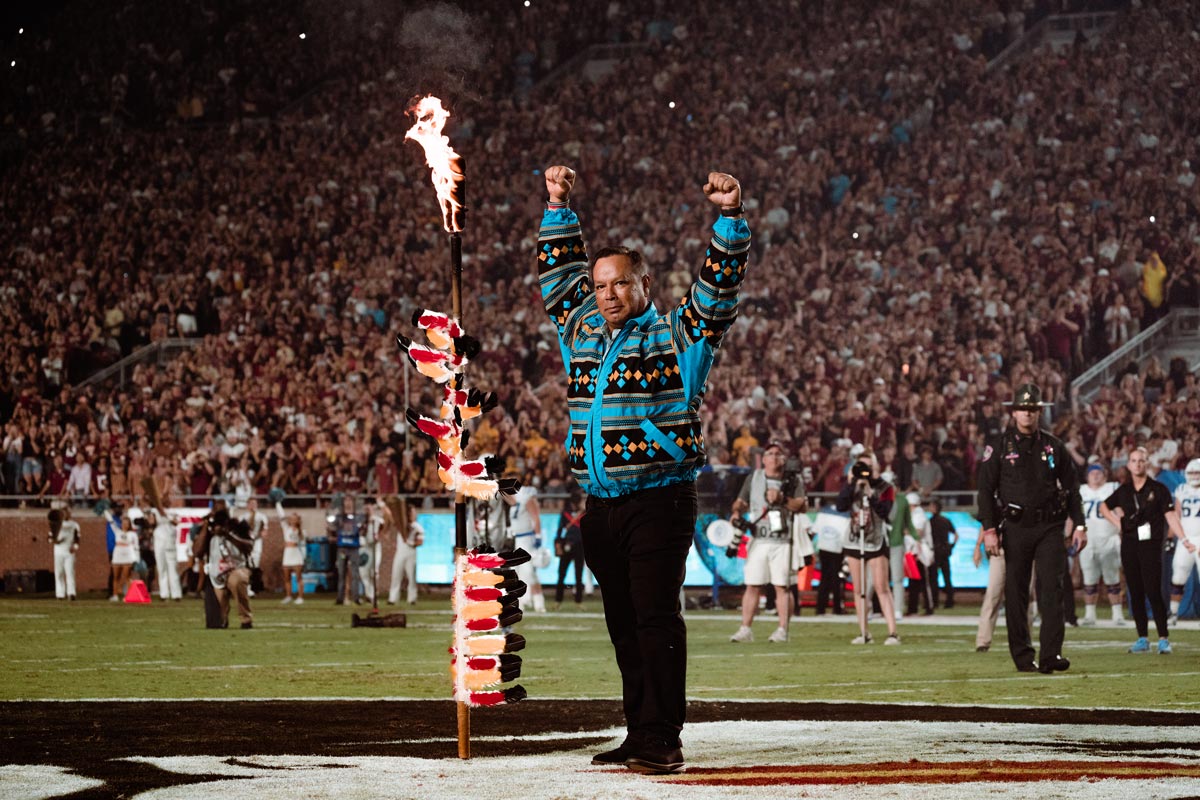 Seminole Tribe of Florida Chairman Marcellus W. Osceola Jr. gestures to the crowd after planting the spear at midfield Oct. 21, 2023.