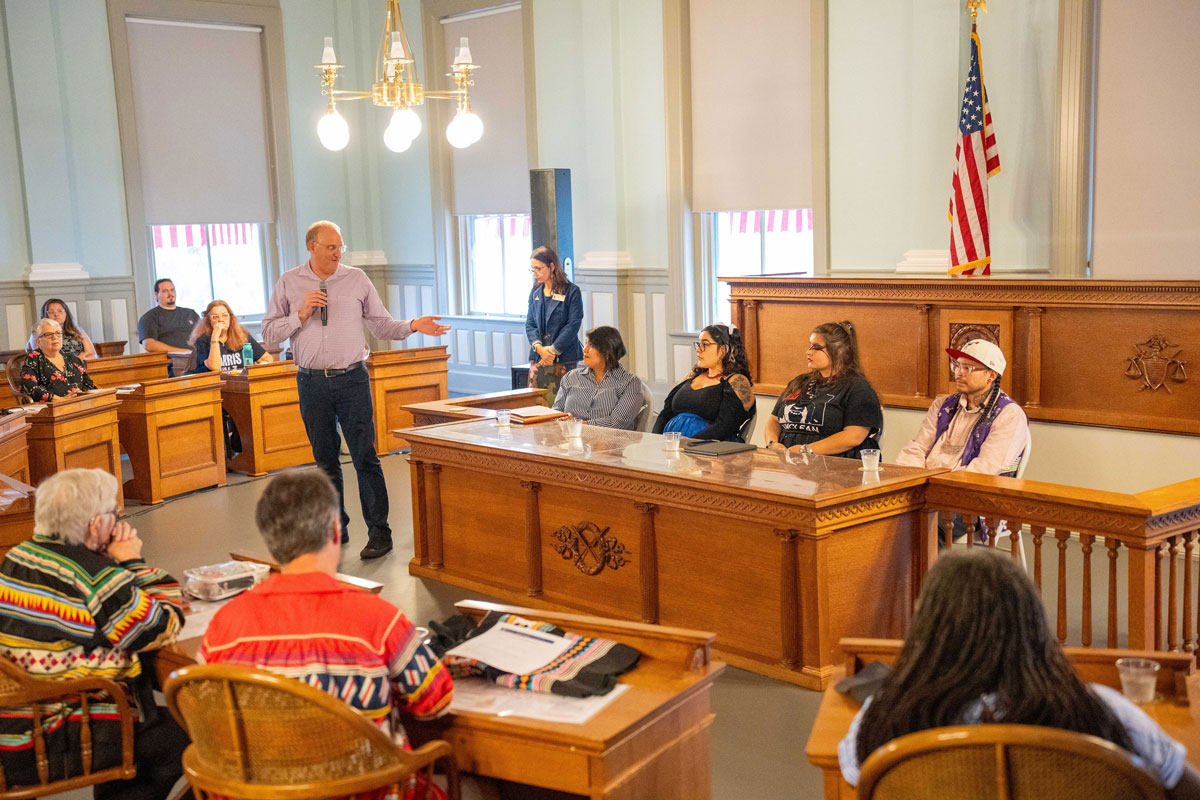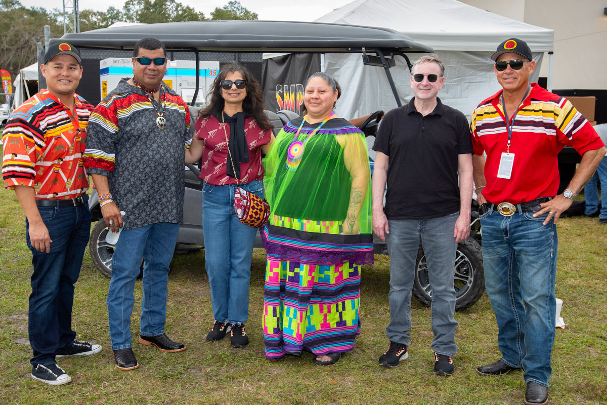 FSU President Richard McCullough and First Lady Dr. Jai Vartikar visit with Seminole Tribe members Kyle Doney, Brighton Councilman Larry Howard, Big Cypress Councilwoman Mariann Billie, and Hollywood Councilman Christopher Osceola, February 17, 2024.